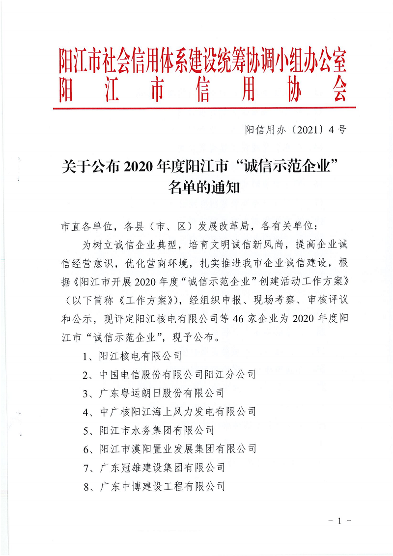 诚信是中华民族的传统美德,是和谐社会的道德基础,是每个社会公民的立身之本。2021年5月14日下午,阳江市信用协会一届二次会员大会暨2020年度阳江市“诚信示范企业”颁奖仪式隆重举行。
